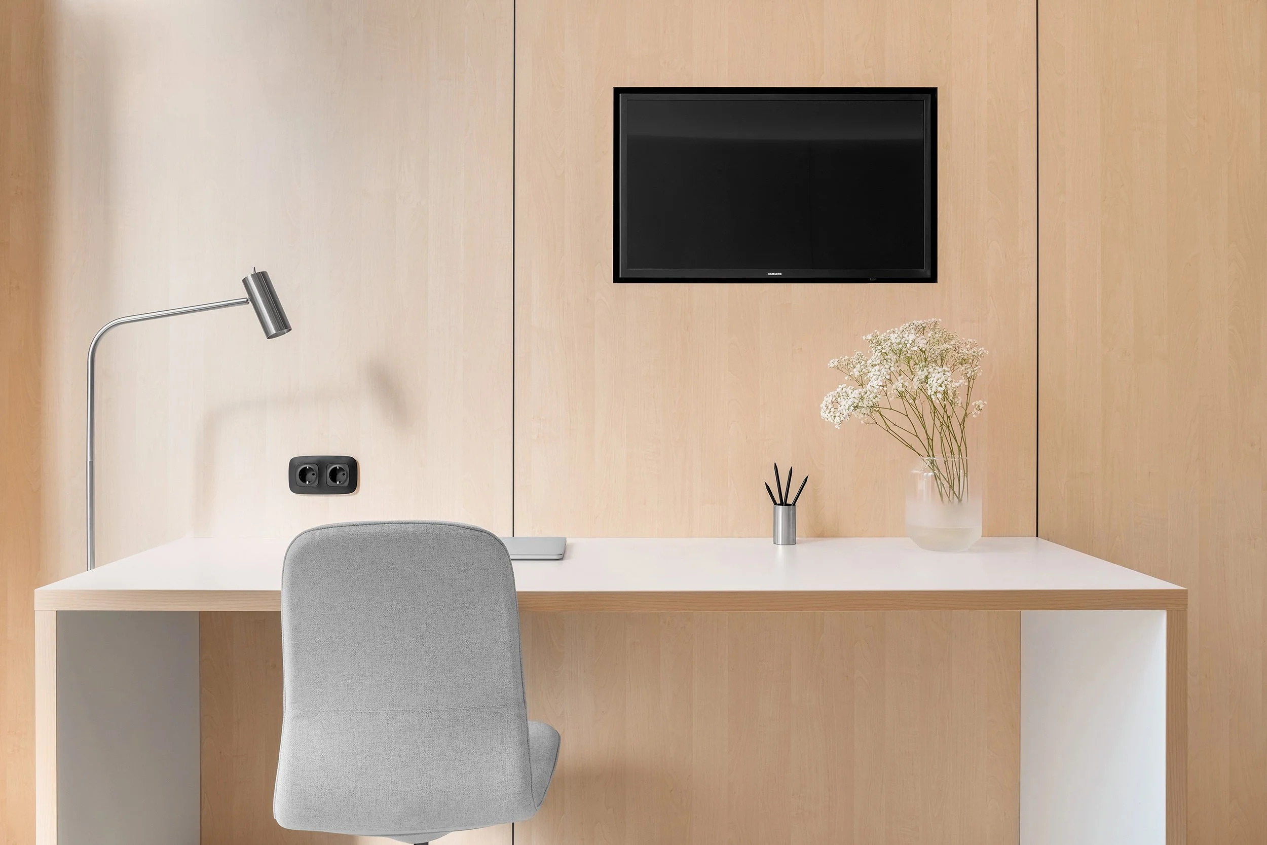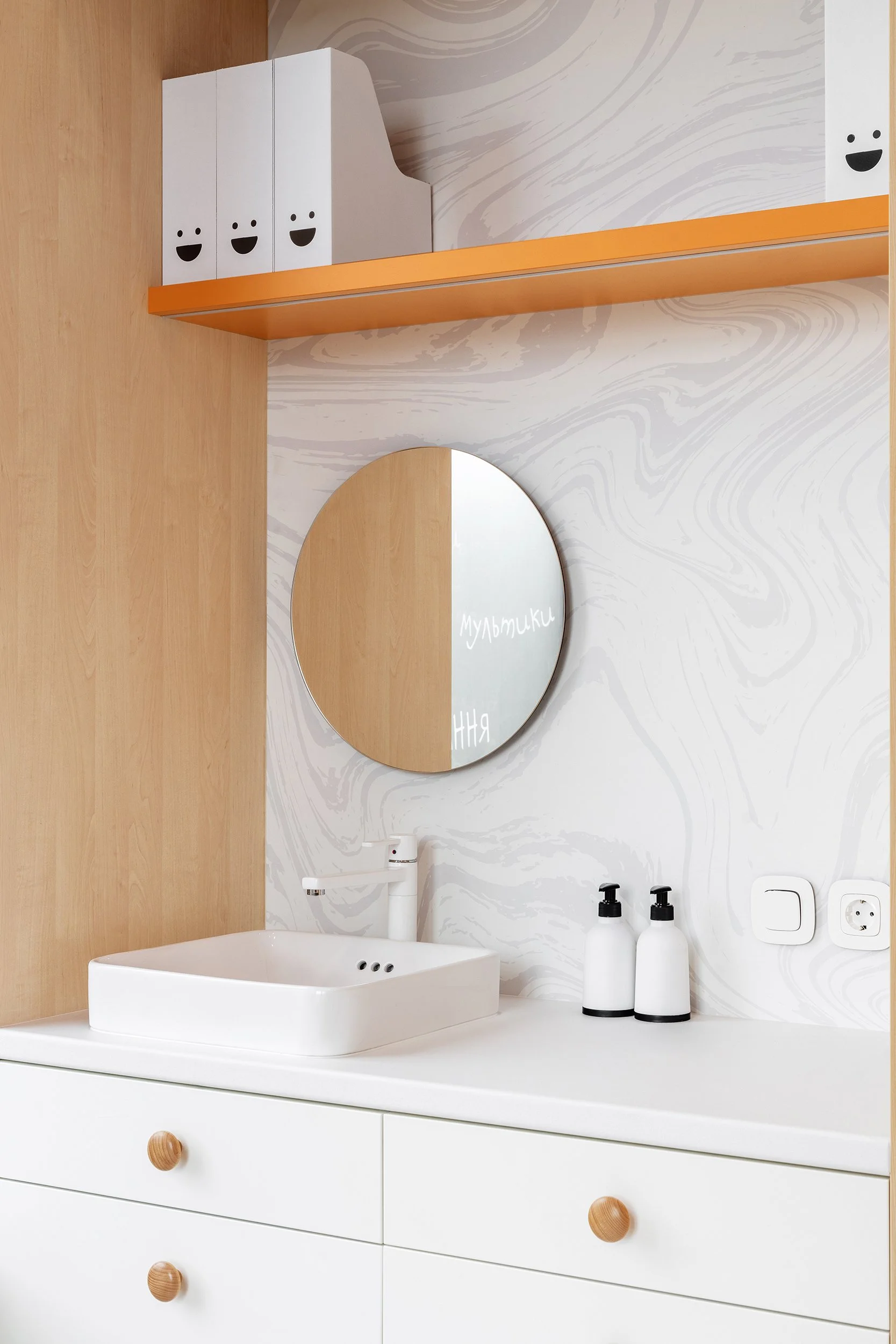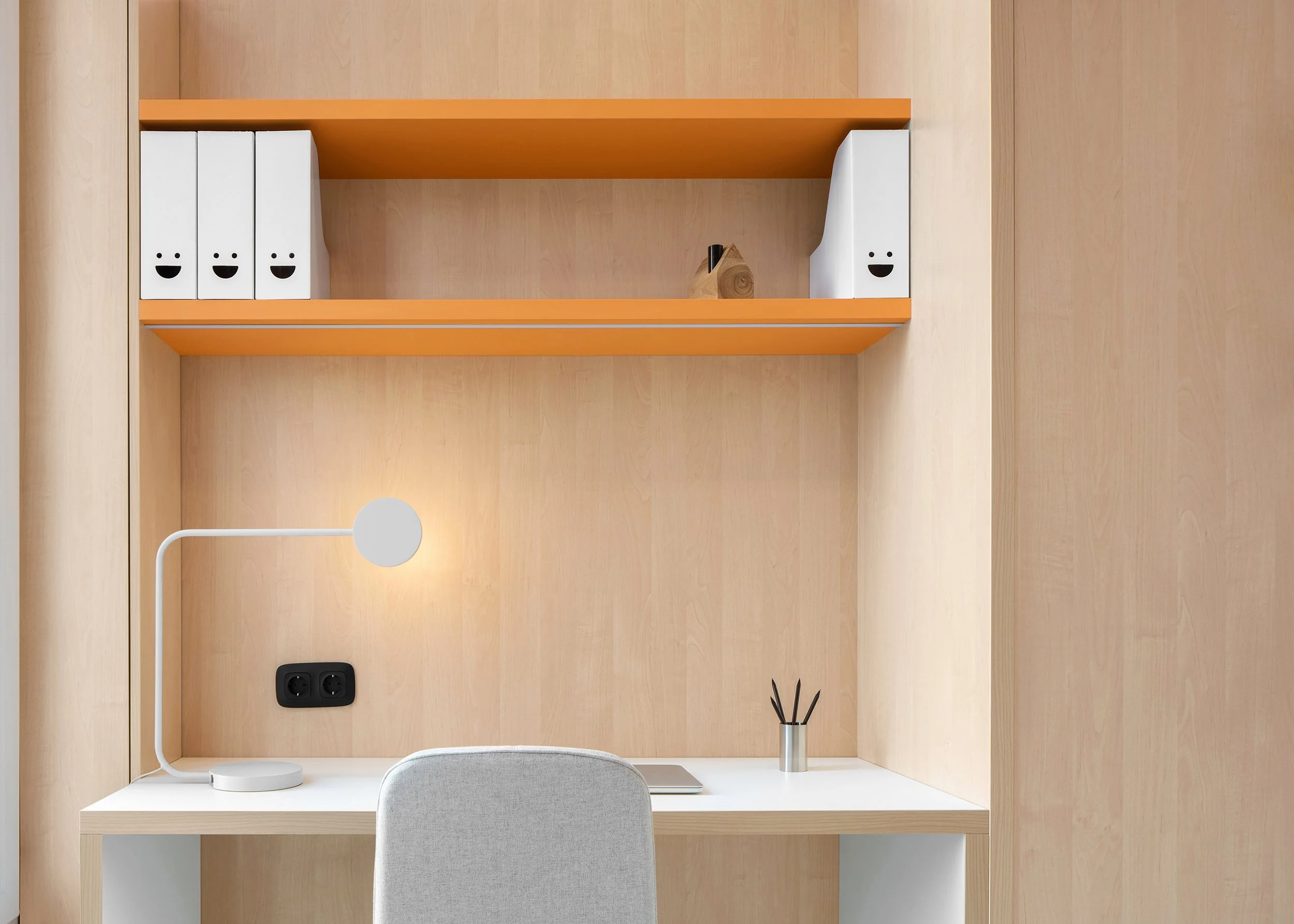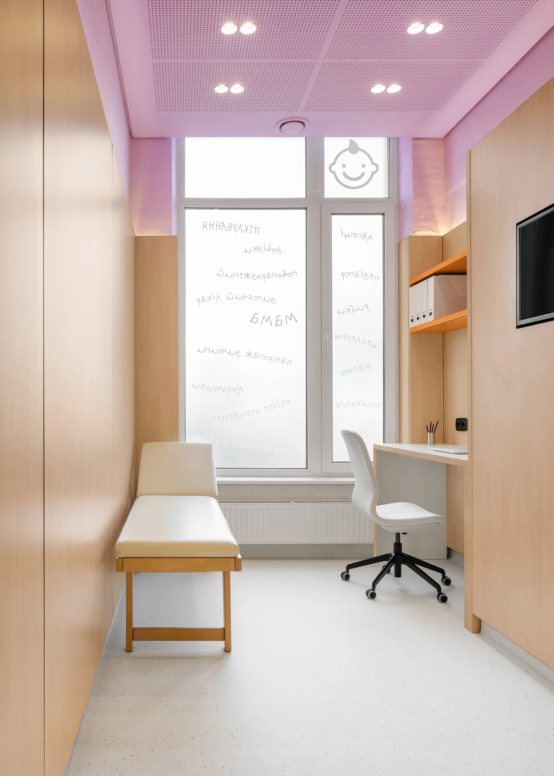 Consultation rooms are fully equipped for pediatric practice, yet all medical instruments and supplies are concealed within custom-built storage systems. This approach reduces visual stress and supports a child-friendly environment.