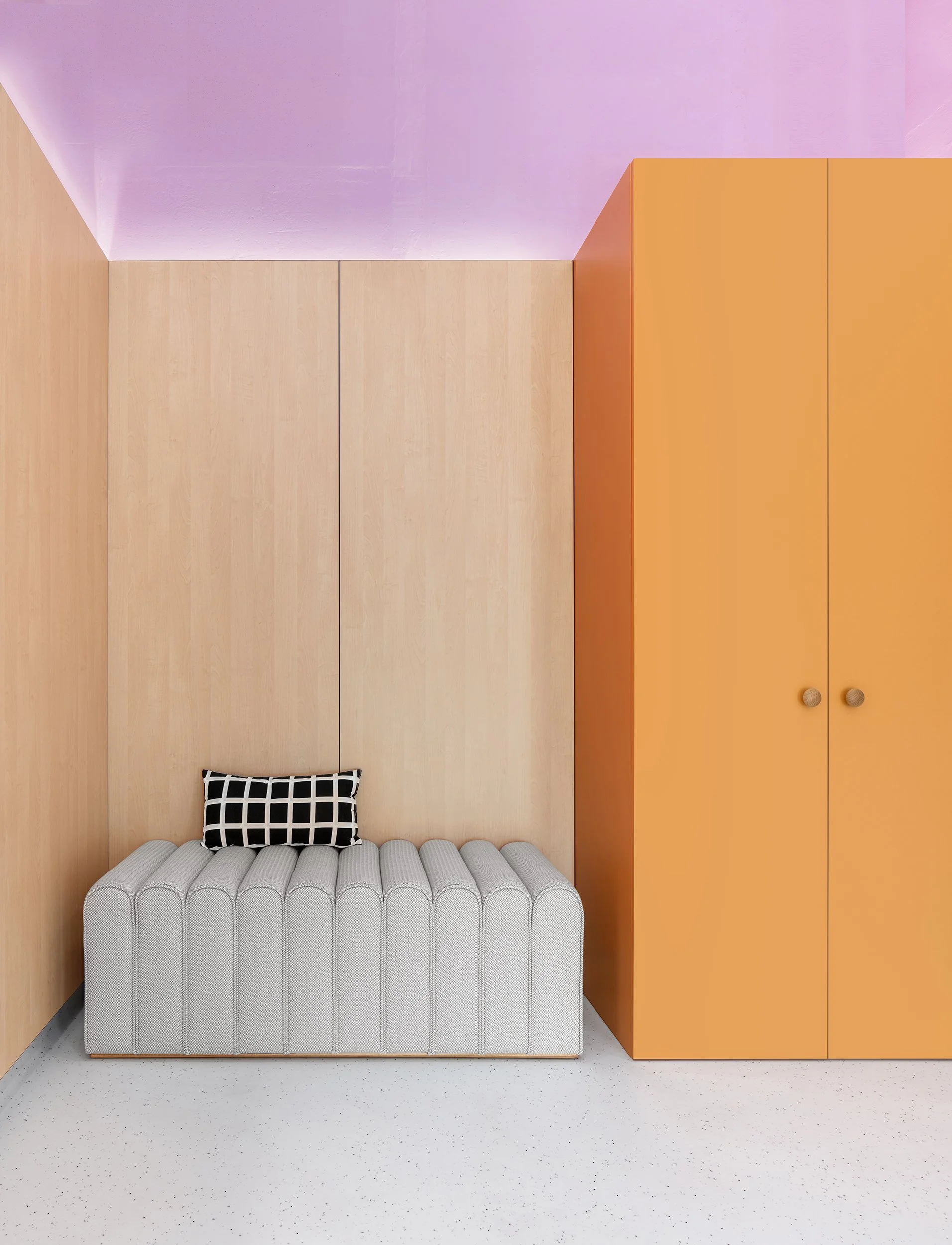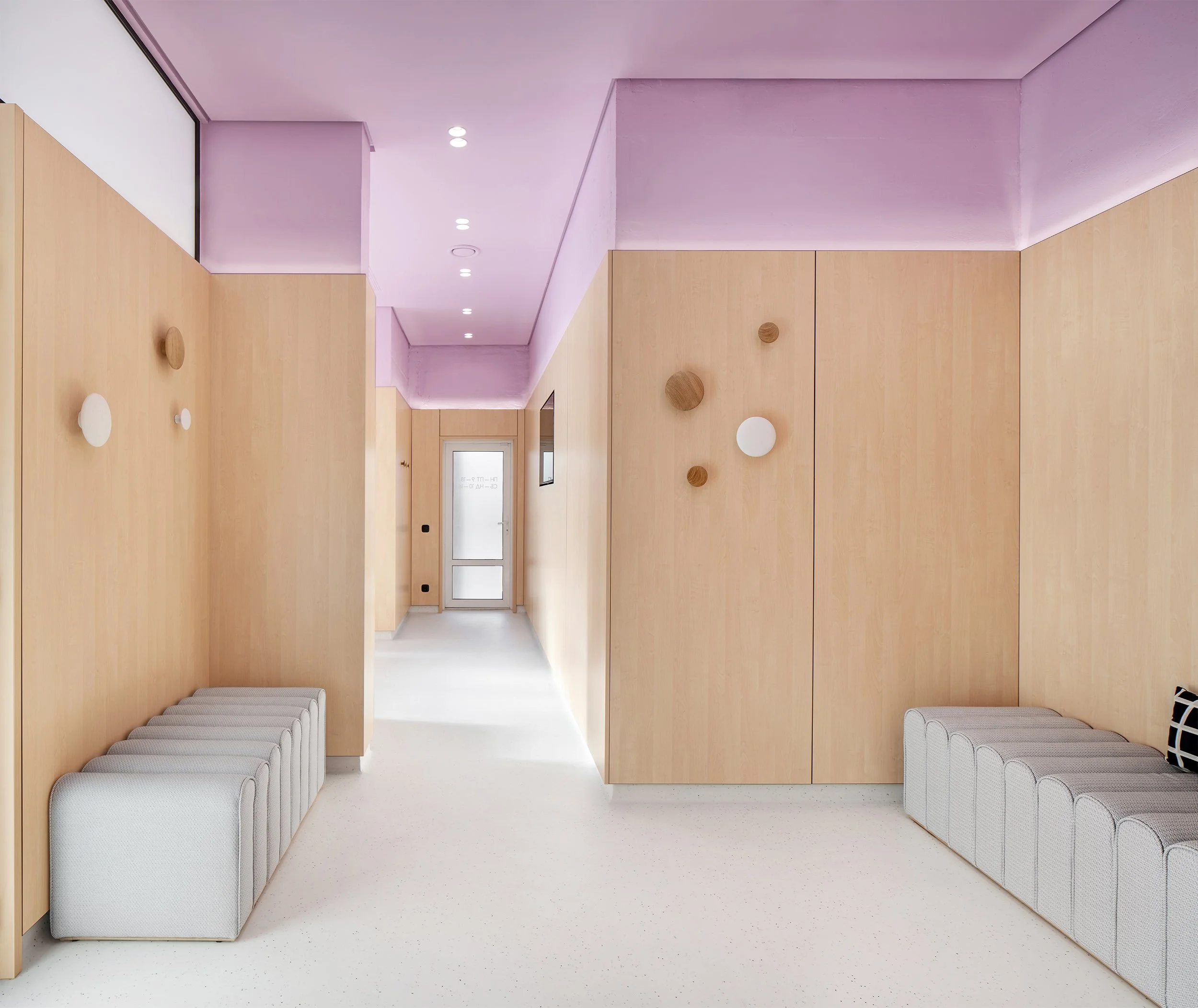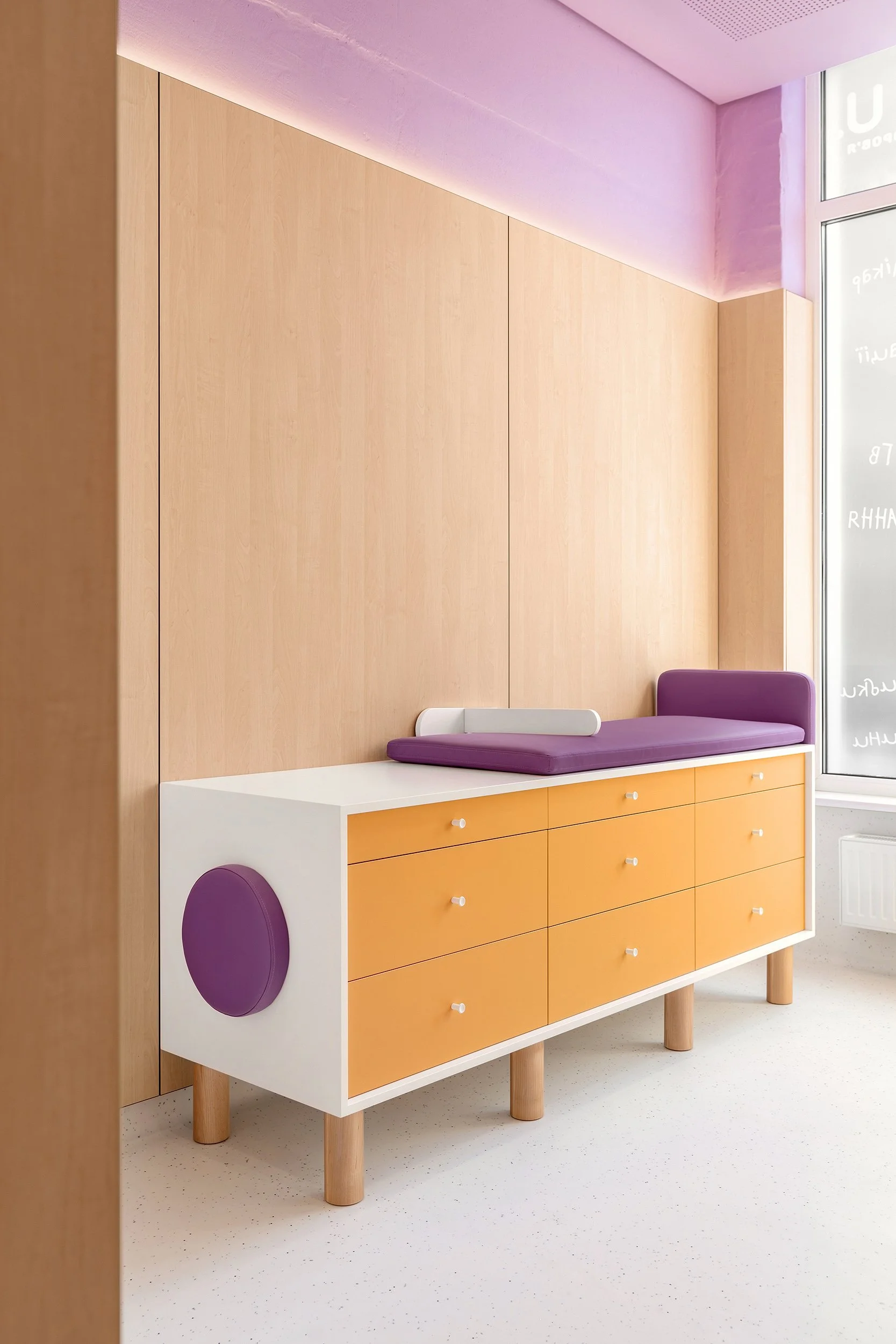 A seamless, slip- and scratch-resistant floor meets medical standards while its light tone reinforces cleanliness without evoking a sterile atmosphere. Color defines the clinic’s identity: a pale lavender base creates a calm backdrop, accented by vibrant orange for warmth and playfulness.