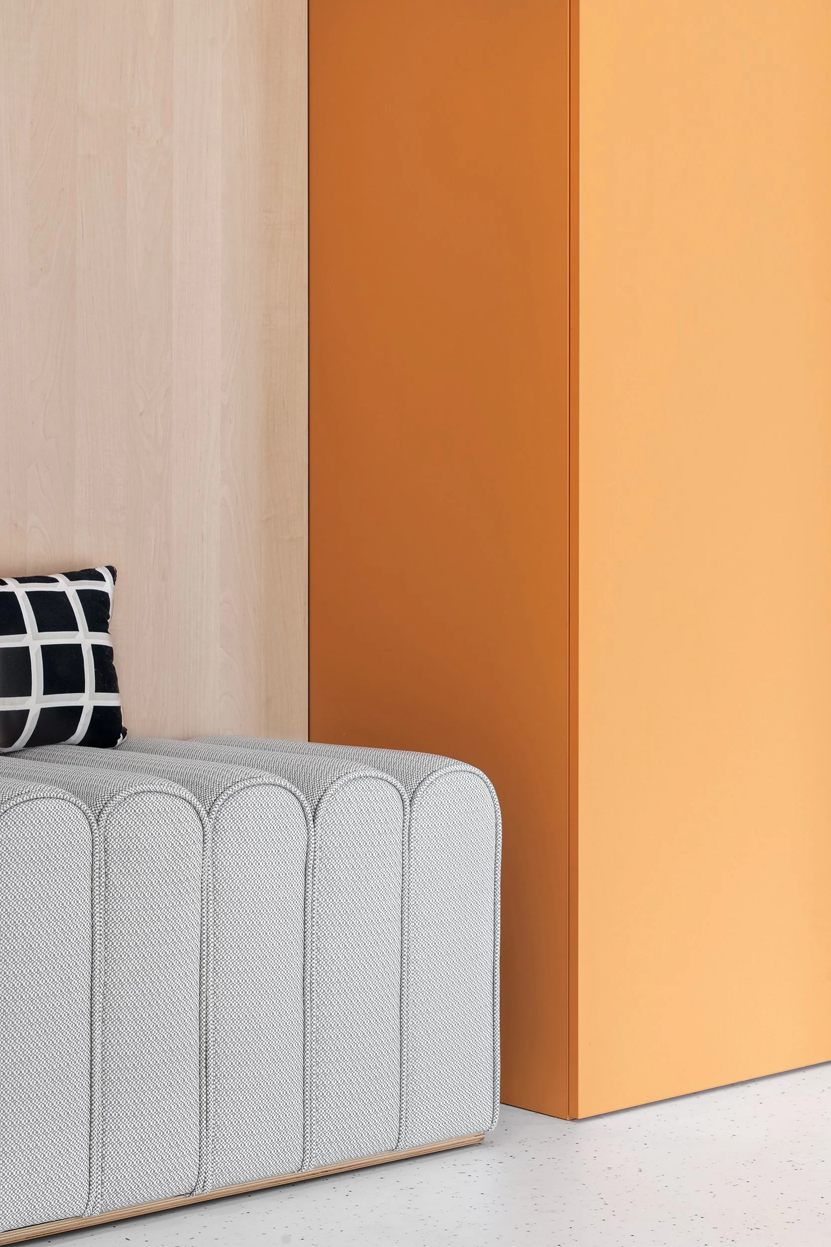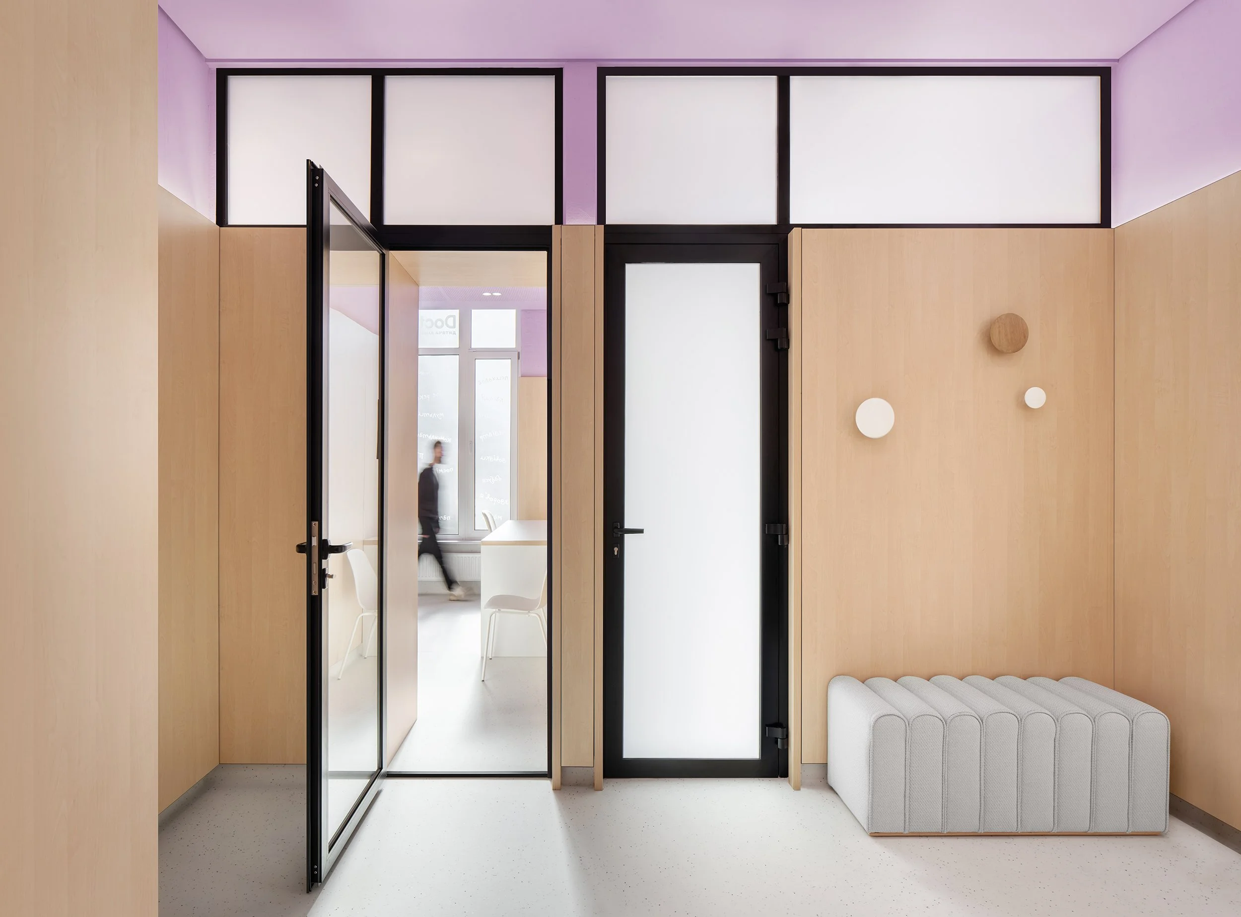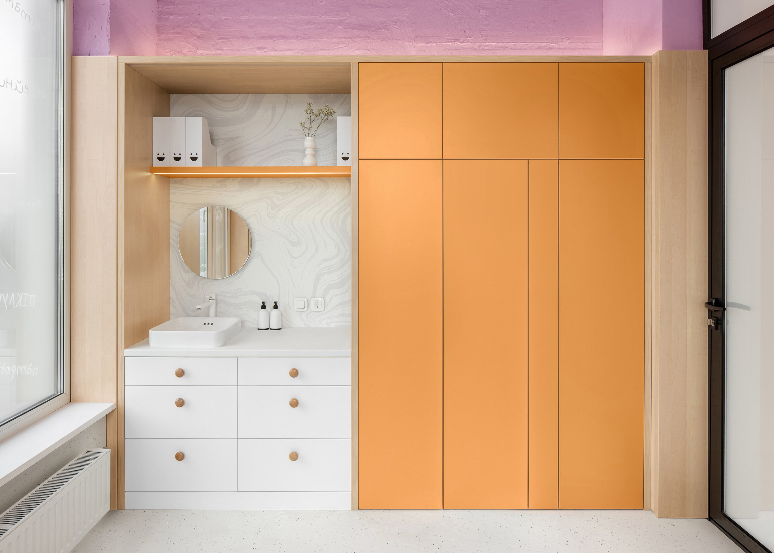 A seamless, slip- and scratch-resistant floor meets medical standards while its light tone reinforces cleanliness without evoking a sterile atmosphere. Color defines the clinic’s identity: a pale lavender base creates a calm backdrop, accented by vibrant orange for warmth and playfulness.